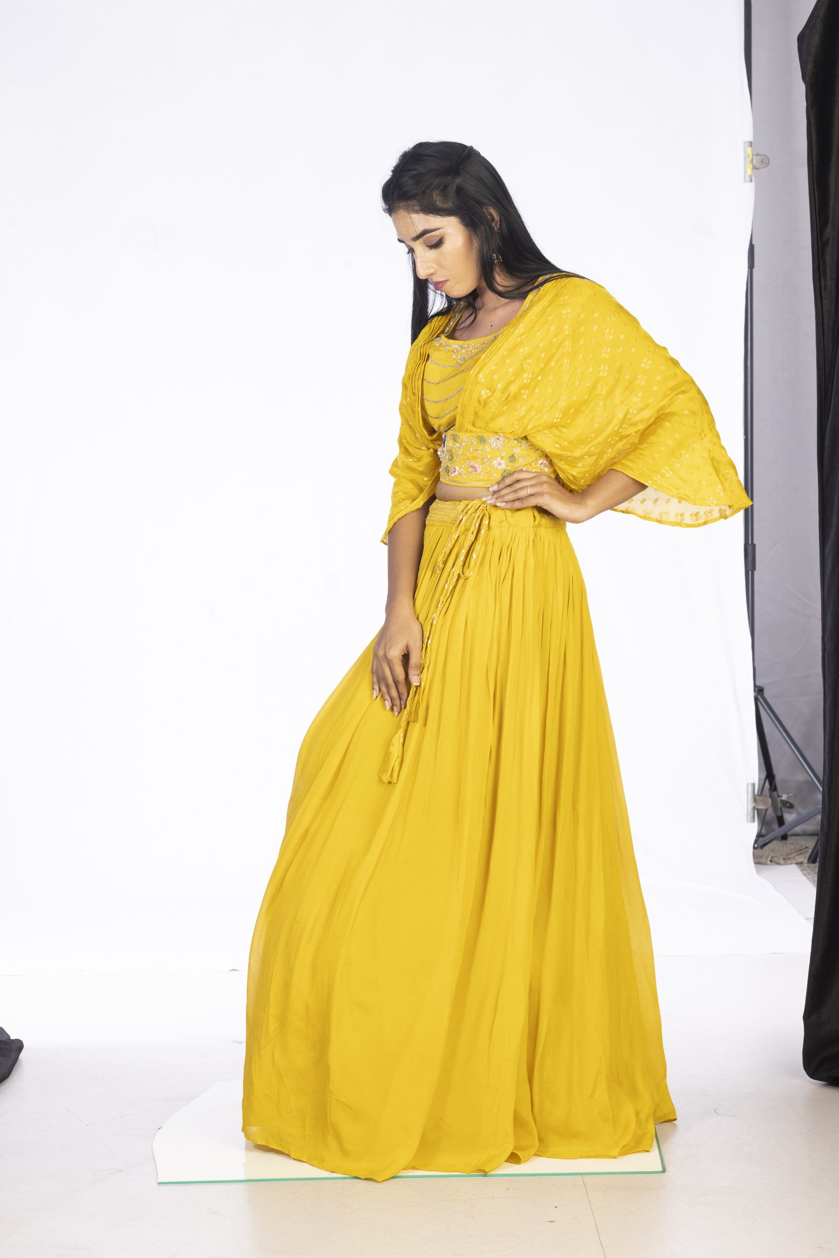 Elevate your ethnic style with the Kardana Work Indowestern Set, a fusion of traditional and modern elements. This stunning set consists of a crop top with designer sleeves, adding a touch of sophistication to your overall look. The top is paired with a beautifully crafted pleated skirt, featuring intricate Kardana work that adds a touch of elegance and sophistication. The unique combination of a bustier and a flowing skirt creates a dramatic, eye-catching effect. Perfect for special occasions, festivals, and social gatherings, this Indowestern set is sure to make you the centre of attention.