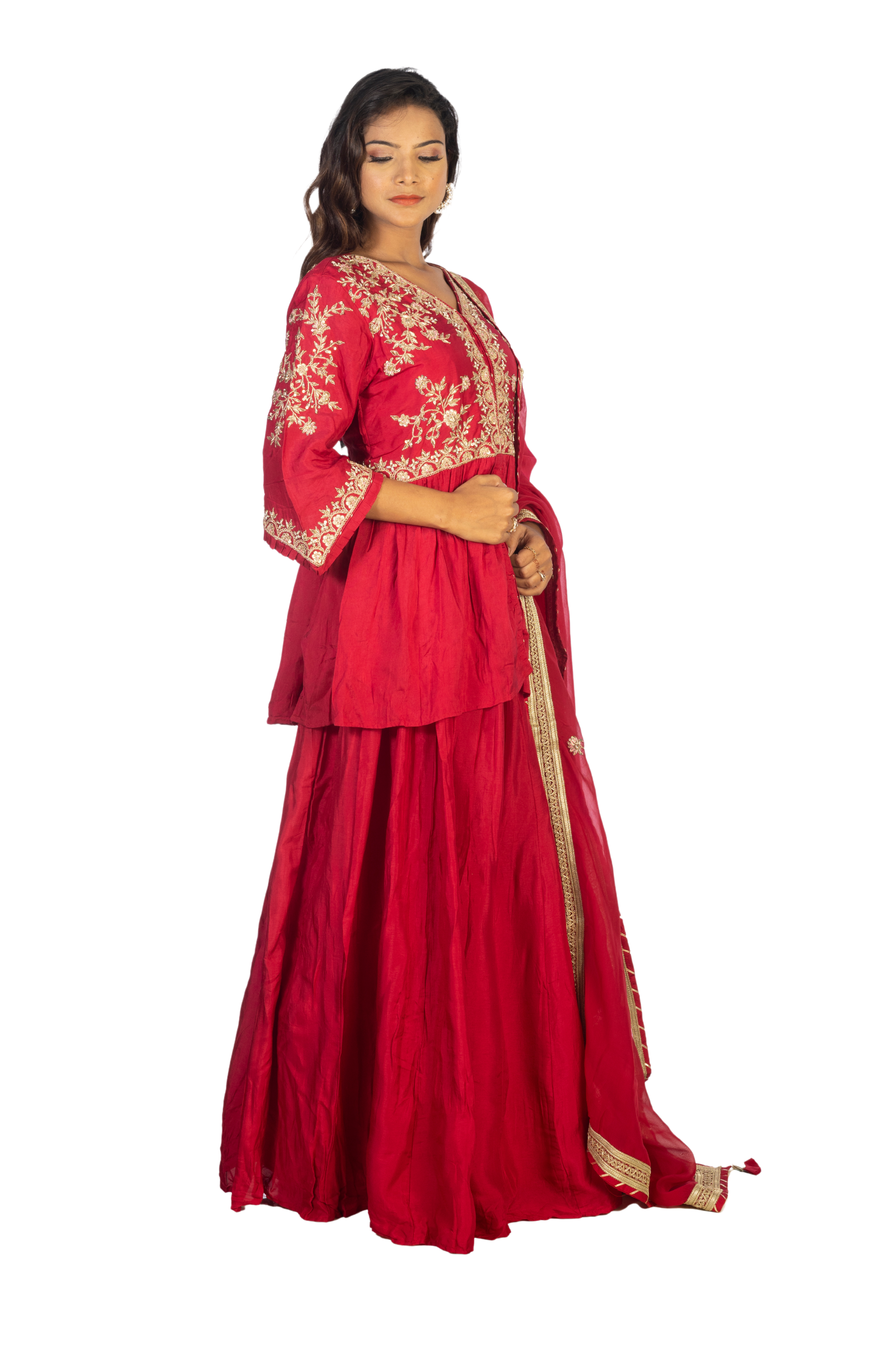 Elevate your ethnic wardrobe with this stunning Maroon Silk Indowestern Dress, intricately adorned with exquisite Gajai work. Crafted from luxurious silk, this dress exudes elegance and sophistication, making it perfect for special occasions and festive celebrations. The ensemble is completed with a delicate organza dupatta that adds a touch of sheer grace to the overall look. Pair this outfit with statement jewelry and heels to make a lasting impression.
